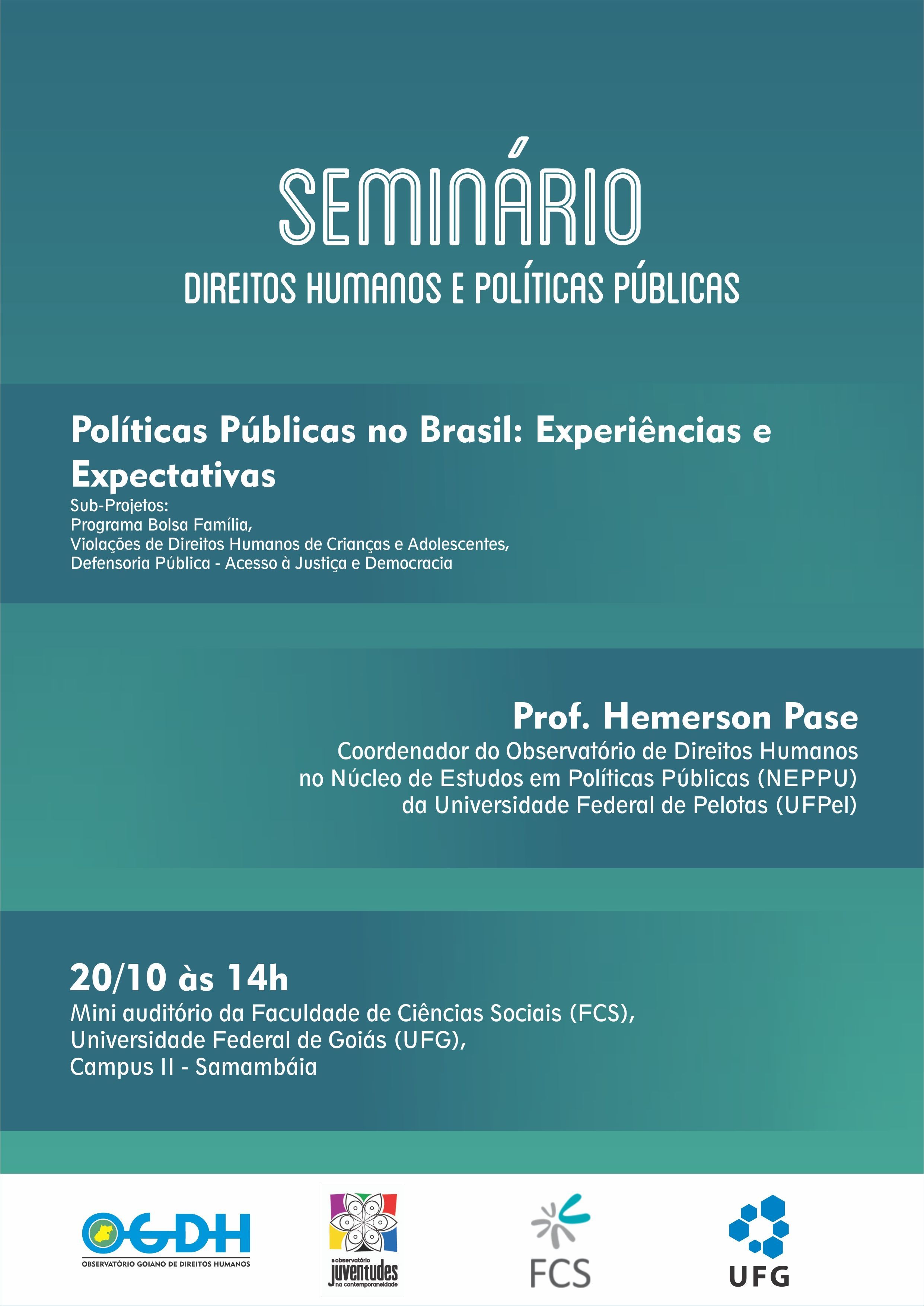 O Observatório Goiano dos Direitos Humanos promove, no próximo dia 20 de outubro, às 14h, na Faculdade de Ciências Sociais da UFG, um seminário sobre direitos humanos e políticas públicas com a participação do professor Hemerson Pase, da UFPEL.